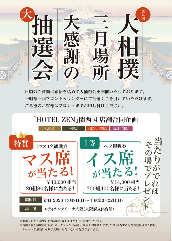 ホテルZEN 関西4店舗 (ホテルゼン平野・ホテルゼンRIKYU平野・ホテルゼン八尾・ホテルゼン奈良宝来)にて 大相撲観戦ペアチケットがその場で当たる、くじ引き抽選イベントを開催しています! マス席とイス席をご用意しておりますので、お早めににご来店くださいませ。 チケットがなくなり次第終了となります。 皆様のお越しを心よりお待ちしております。